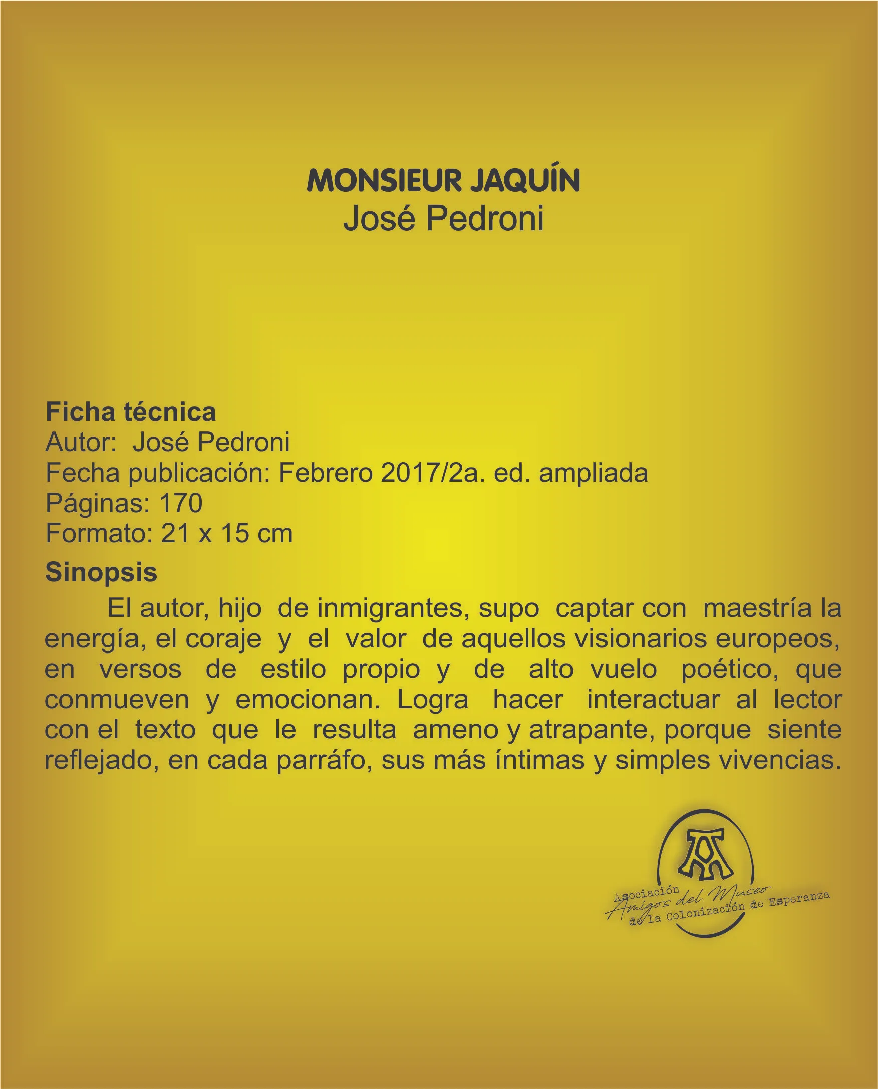 El autor, hijo de inmigrantes, supo captar con maestría la energía, el coraje y el valor de aquellos visionarios europeos, en versos de estilo propio y de alto vuelo poético, que conmueven y emocionan. Logra hacer interactuar al lector con el texto que le resulta ameno y atrapante, porque siente reflejado, en cada párrafo, sus más íntimas y simples vivencias.